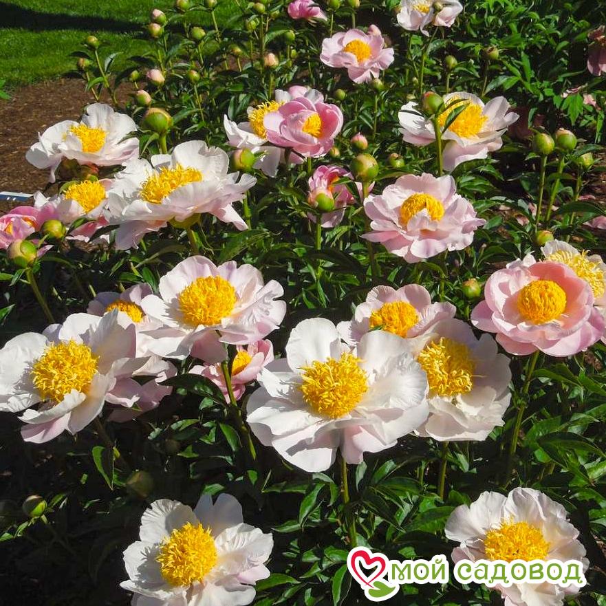 Цветок японской формы с широкими светло-розовыми лепестками, окружающими плотный шар из кружевных изогнутых стаминодий бледно-жёлтого цвета. Листва тёмно-зелёная. Стебли очень прочные. Высота 75 см. Цветение обильное, в средние сроки. Эталон качества среди ландшафтных пионов, один из самых дождеустойчивых. Правила ухода за растением Пионы не следует сажать в тени кустов и деревьев, нельзя выбирать место, где дует северный ветер, в низинах, где задерживается влага и скапливается снег. Это важно учесть при выборе места посадки. Высадку в грунт предпочтительно осуществлять осенью до середины октября. При необходимости делают это в марте до начала прорастания почек. Основные правила ухода: обильный полив при засухе, рыхление почвы или ее мульчирование, своевременные подкормки. Купить гибрид пиона Гарден Треже предлагаем в нашем интернет магазине. На сайте вы найдете каталог с описанием растений, условиями оплаты и доставки. Рассаду нам поставляют из проверенного питомника, поставщик гарантирует качество товара. Продукция сертифицирована. Корневище имеет  3-5 почек, соответственно упаковано. Доставка осуществляется Почтой России в любой ее регион. Возможна отправка за рубеж с помощью ТК СДЭК.